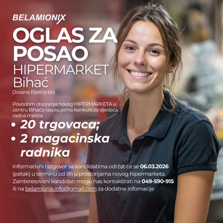 Povodom otvorenja novog HIPERMARKETA u centru Bihaća raspisujemo konkurs za sljedeća radna mjesta: -20 trgovaca -2 magacinska radnika Informativni razgovor